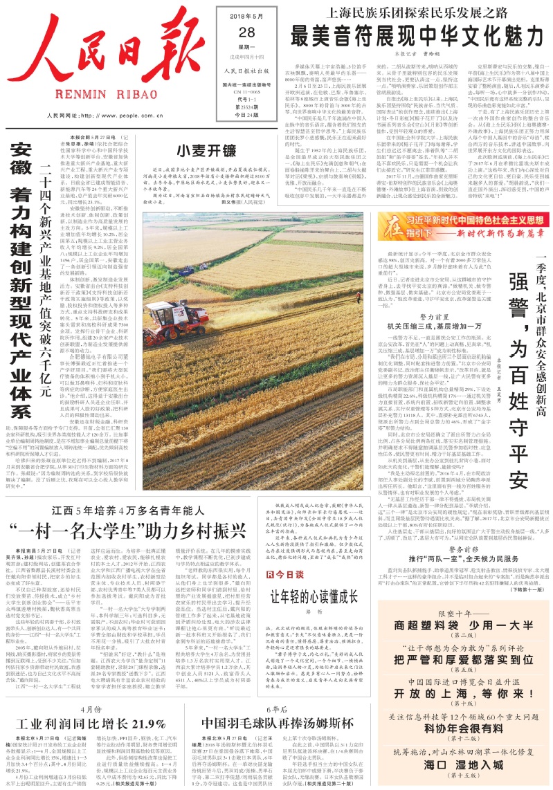 《人民日报》(2018052801版)刊载《江西5年培养4万名青年能人“一村一名大学生”助力乡村振兴》,报道“一村一名大学生”工程取得的卓越成果。