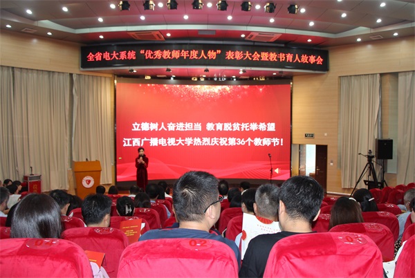 为热烈庆祝全国第36个教师节,集中展示电大人深入学习贯彻习近平新时代中国特色社会主义思想,持续实施“奋进之笔”的进展成效,展现广大教师立足教育教学岗位助力打赢新冠肺炎疫情防控阻击战、教育脱贫攻坚战的精神风貌,9月10日上午,学校在青山湖校区举办2020年全省电大系统“优秀教师年度人物”表彰大会暨教书育人故事会。学校党委书记易小明,党委副书记、校长朱爱莹,党委副书记黄平槐,党委委员、纪委书记王水平,副校长刘平、邱东升出席,2020年全省电大系统“优秀教师年度人物”、省电大副处级以上领导干部、部分教师代表参加。