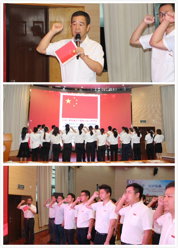 根据会议安排,表彰大会暨教书育人故事会还组织新进教师开展入职宣誓仪式。新进教师代表们面对国旗,衣着整齐、目光坚毅、右手举拳,在领誓人邱东升的带领下,高声诵读《江西广播电视大学教师入职宣誓誓词》,句句铿锵有力、字字感深肺腑。