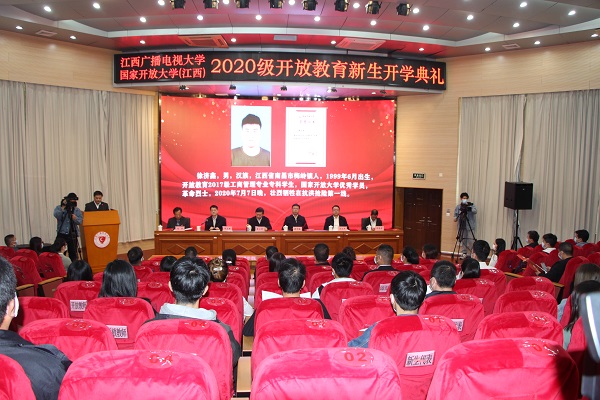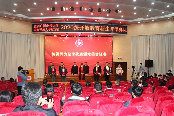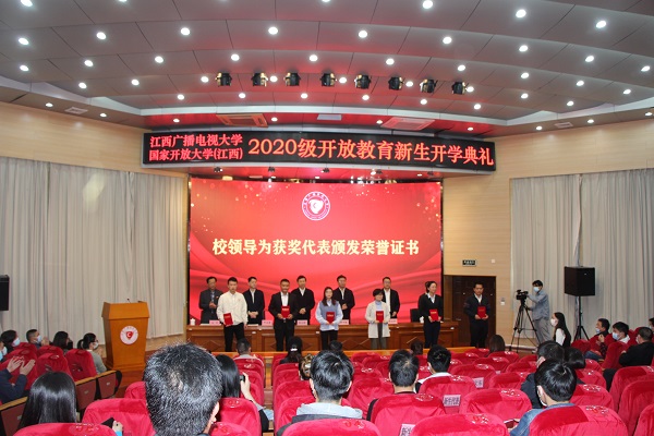 邱东升宣读了《江西广播电视大学关于表彰新冠肺炎疫情防控学生先进个人的决定》。刘平宣读了2019年度国家开放大学奖学金、“希望的田野”奖学金、“长征带”教育精准扶贫工程专项奖学金表彰决定。出席开学典礼的校领导共同为获奖代表颁发了荣誉证书。