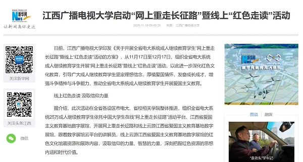 为深入贯彻落实习近平总书记视察江西时关于“推进传承红色基因”的重要要求,传承弘扬井冈山精神、苏区精神和长征精神,走好新时代的长征路,从11月17日至12月17日,江西广播电视大学组织全省电大系统成人继续教育学生开展“网上重走长征路”暨线上“红色走读”活动,以实际行动迎接建党100周年。活动的开展引发了各界关注。