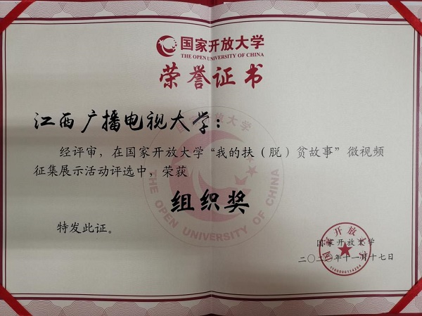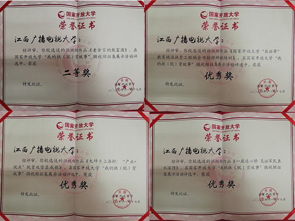近日,国家开放大学“我的扶(脱)贫故事”微视频大赛评选结果揭晓,买球官网扶贫故事《老余家的致富酒》荣获得二等奖、《国家开放大学“长征带”教育精准扶贫工程瑞金市脐橙种植培训》、《大坪乡上洛村:“产业+就业”脱贫攻坚显成效》、《一座连心桥 见证军民鱼水深情》荣获优秀奖,买球官网荣获组织奖。