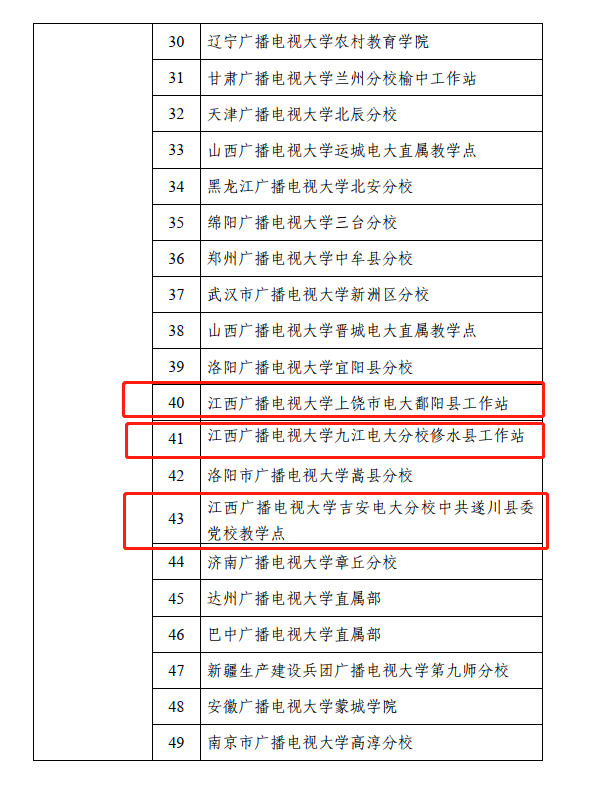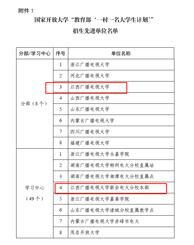 近日,国家开放大学公布了“教育部‘一村一名大学生计划’”招生先进单位评选结果,买球官网及新余电大分校本部、上饶市电大鄱阳县工作站、九江电大分校修水县工作站、吉安电大分校中共遂川县委党校教学点被评为国家开放大学“教育部‘一村一名大学生计划’”招生先进单位。
