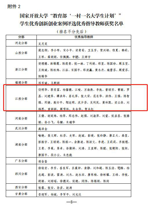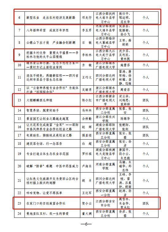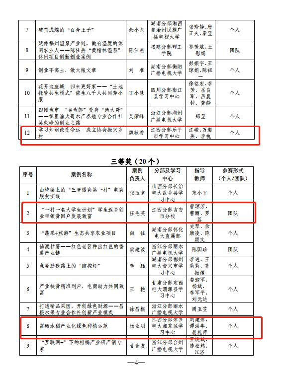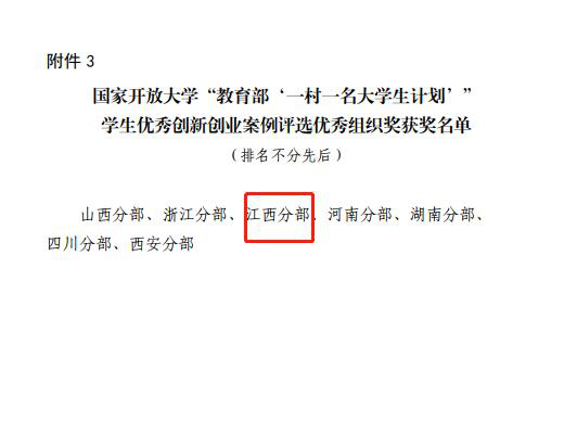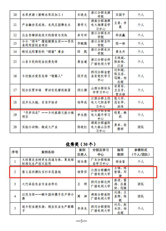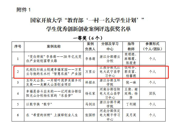 近日,国家开放大学公布国家开放大学“教育部‘一村一名大学生计划’”学生优秀创新创业案例评选结果,买球官网学生申报的案例获得一等奖1名,二等奖1名,三等奖3名,优秀奖5名。其中,万里云《扎根红杉故土创建幸福家园——万里云与他的长水村“智慧农旅”产业园》荣获一等奖,魏秋香《学习知识改变命运 成立协会振兴乡村》荣获二等奖,庄毛英《“一村一名大学生计划”学生返乡创业带领贫困户发展致富》、杨业明《富硒水稻产业化绿色种植示范》、杨华成《迈步从头越,甘当开拓者》荣获三等奖,谢贤荣《崇义县田源红豆杉示范基地》、邓龙仔《新型农业 走出农村经济发展新路》、李松林《挖掘乡村优势重塑太平盛景——李松林与他的太平山茶情缘》、陈小红《大棚麒麟西瓜种植》、贺小云《在家门口的百姓致富合作社》荣获优秀奖。买球官网教师饶明华等29人获得优秀指导教师称号,买球官网获得优秀组织奖。