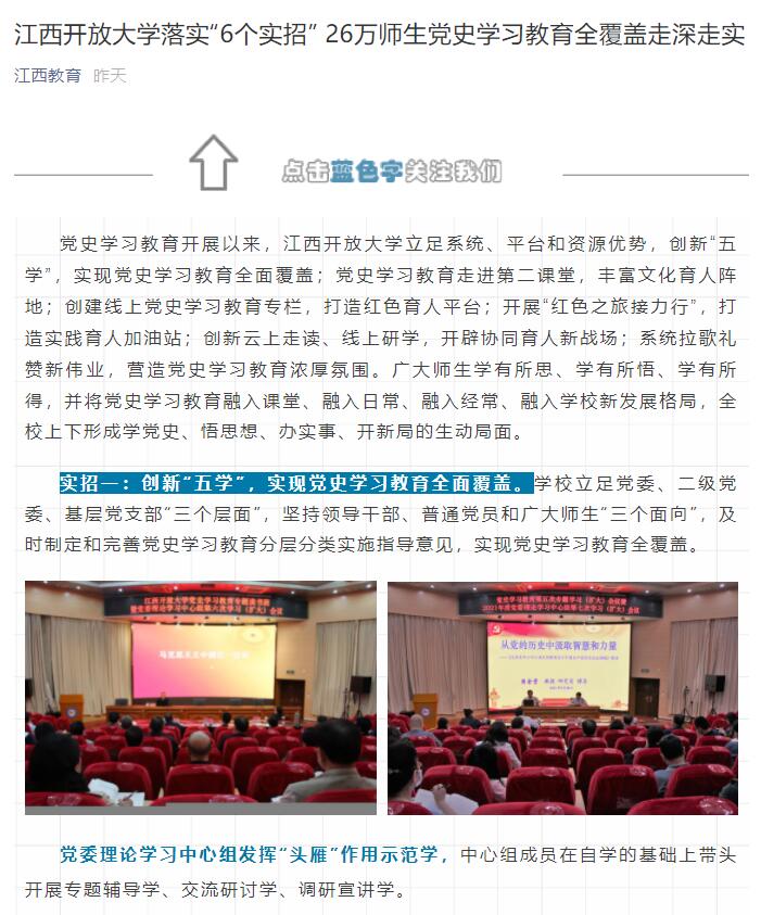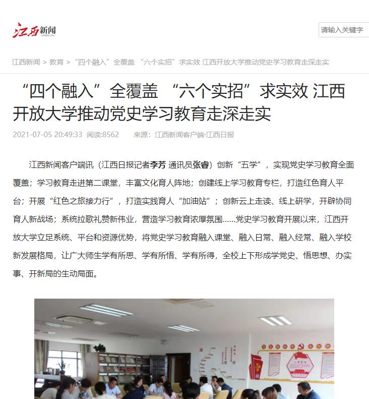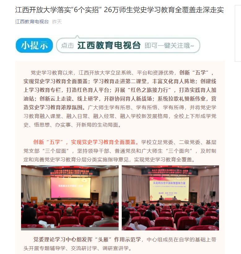 党史学习教育以来,买球的app排行榜前十名推荐立足系统、平台和资源优势,创新“五学”,实现党史学习教育全面覆盖;学习教育走进第二课堂,丰富文化育人阵地;创建线上学习教育专栏,打造红色育人平台;开展“红色之旅接力行”,打造实践育人加油站;创新云上走读、线上研学,开辟协同育人新战场;系统拉歌礼赞新伟业,营造党史学习教育浓厚氛围。广大师生学有所思、学有所悟、学有所得,并将党史学习教育融入课堂、融入日常、融入经常、融入学校新发展格局,全校上下形成学党史、悟思想、办实事、开新局的生动局面。近日,江西日报、江西新闻、江西教育、江西教育电视台等媒体对此进行报道。