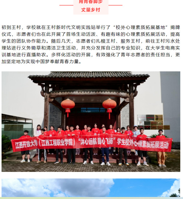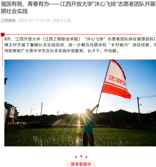 6月,买球的app排行榜前十名推荐(江西工程职业学院)“沐心飞扬”志愿者团队前往婺源县秋口镇王村开展了暑期社会实践活动,进一步整合巩固学校“乡村振兴”项目成果,引导和帮助广大青年学生在社会实践中受教育、长才干、作贡献。