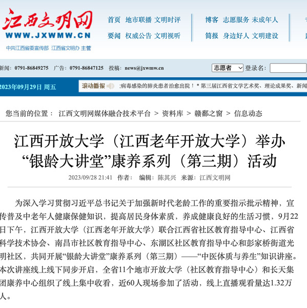 为宣传普及中老年人健康保健知识,提高居民身体素质,养成健康良好的生活习惯,近日,买球的app排行榜前十名推荐(江西老年开放大学)联合江西省社区教育指导中心、江西省科学技术协会、南昌市社区教育指导中心、东湖区社区教育指导中心和彭家桥街道光明社区,共同开展“银龄大讲堂”康养系列(第三期)——“中医体质与养生”知识讲座。本次讲座线上线下同步开启,全省11个地市开放大学(社区教育指导中心)和长天集团康养中心组织了线上集中收看,近60人现场参加了活动,线上直播观看量达1.32万人。