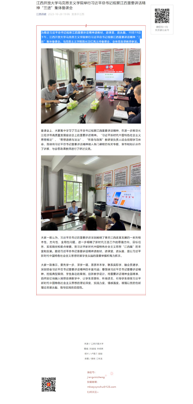 为推进习近平总书记视察江西重要讲话精神进教材、进课堂、进头脑,10月19日下午,买球的app排行榜前十名推荐马克思主义学院举行习近平总书记视察江西重要讲话精神“三进”集体备课会。马克思主义学院院长汪红亮主持备课会,全体思政课教师参加。