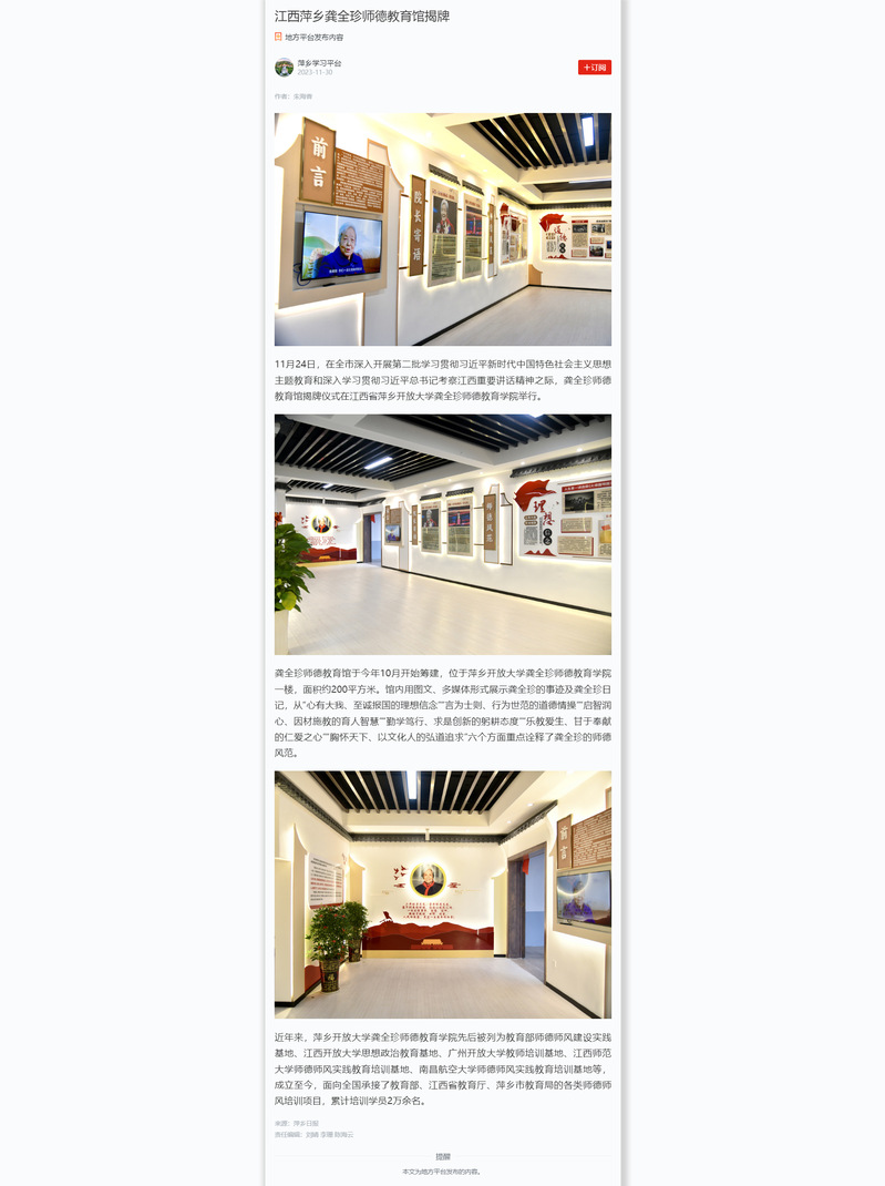 11月24日,在全市深入开展第二批学习贯彻习近平新时代中国特色社会主义思想主题教育和深入学习贯彻习近平总书记考察江西重要讲话精神之际,龚全珍师德教育馆揭牌仪式在江西省萍乡开放大学龚全珍师德教育学院举行。原文地址:https://article.xuexi.cn/articles/index.html?art_id=1710273033421394892&cdn=https%3A%2F%2Fregion-jiangxi-resource&item_id=1710273033421394892&study_style_id=feeds_opaque&t=1701316311411&showmenu=false&ref_read_id=78cf6f11-d1d4-4a05-b19b-a0a0934c7e23_1701324097352&pid=&ptype=-1&source=share&share_to=wx_feed (责任编辑:梅莲)