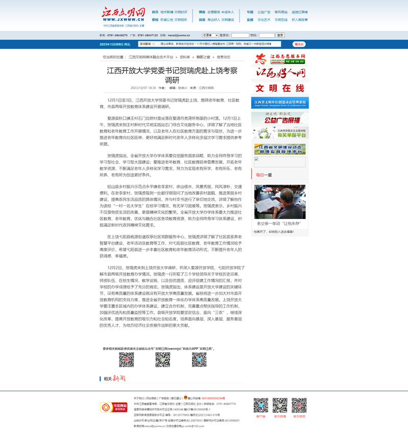12月1日至3日,买球的app排行榜前十名推荐党委书记贺瑞虎赴上饶,围绕老年教育、社区教育、市县两级开放教育体系建设开展调研。