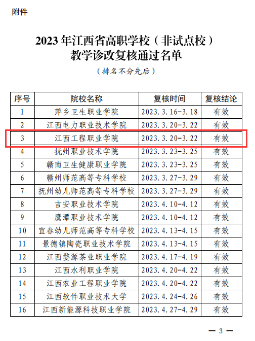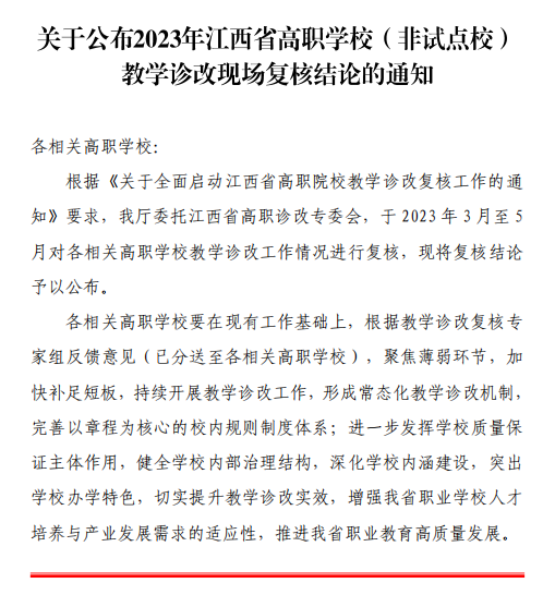近日,江西省教育厅印发《关于公布2023年江西省高职学校(非试点校)教学诊改现场复核结论的通知》,学校顺利通过高职学校(非试点校)教学诊改现场复核。此前,买球官网于2022年7月通过网上复核,2023年3月20日-22日开展现场复核。