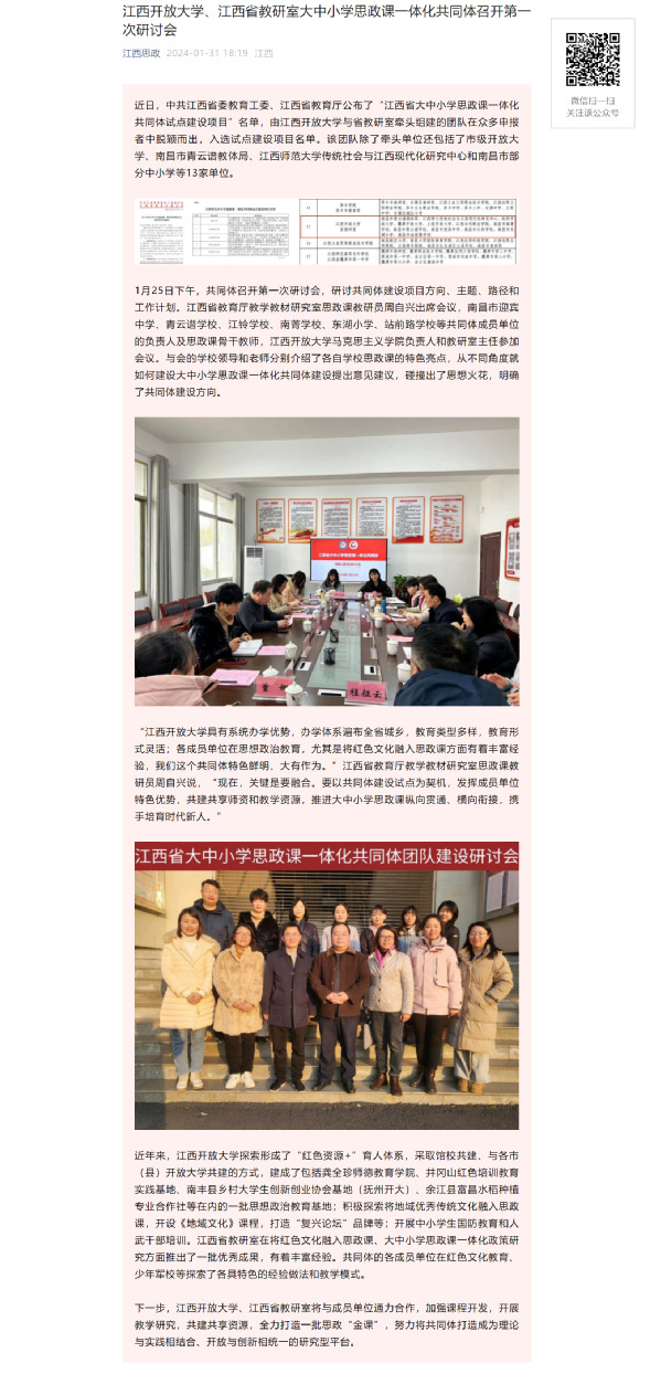 近日,中共江西省委教育工委、江西省教育厅公布了“江西省大中小学思政课一体化共同体试点建设项目”名单,由买球的app排行榜前十名推荐与省教研室牵头组建的团队在众多申报者中脱颖而出,入选试点建设项目名单。该团队除了牵头单位还包括了市级开放大学、南昌市青云谱教体局、江西师范大学传统社会与江西现代化研究中心和南昌市部分中小学等13家单位。
