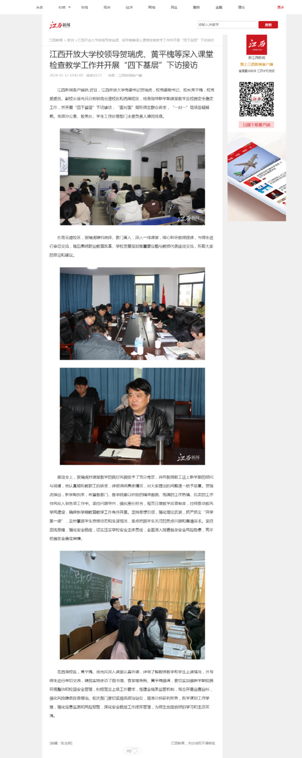 近日,买球的app排行榜前十名推荐党委书记贺瑞虎,校党委副书记、校长黄平槐,校党委委员、副校长徐光兵分别到青云谱校区和西湖校区,检查指导新学期课堂教学及校园安全稳定工作,并开展“四下基层”下访接访,“面对面”倾听师生群众诉求,“一对一”现场答疑解惑。党政办公室、教务处、学生工作处等部门主要负责人陪同检查。