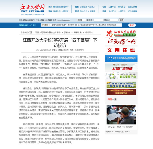 近日,买球的app排行榜前十名推荐党委书记贺瑞虎,校党委副书记、校长黄平槐,校党委委员、副校长徐光兵分别到青云谱校区和西湖校区,检查指导新学期课堂教学及校园安全稳定工作,并开展“四下基层”下访接访,“面对面”倾听师生群众诉求,“一对一”现场答疑解惑。党政办公室、教务处、学生工作处等部门主要负责人陪同检查。