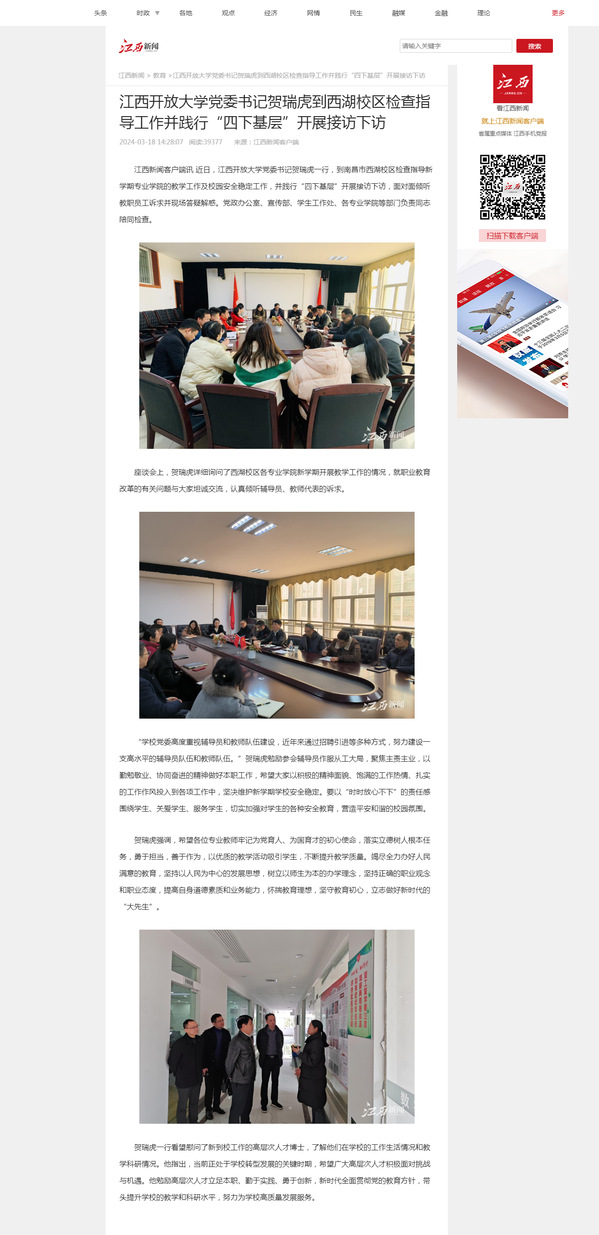 近日,买球的app排行榜前十名推荐党委书记贺瑞虎一行,到南昌市西湖校区检查指导新学期专业学院的教学工作及校园安全稳定工作,并践行“四下基层”开展接访下访,面对面倾听教职员工诉求并现场答疑解惑。党政办公室、宣传部、学生工作处、各专业学院等部门负责同志陪同检查。
