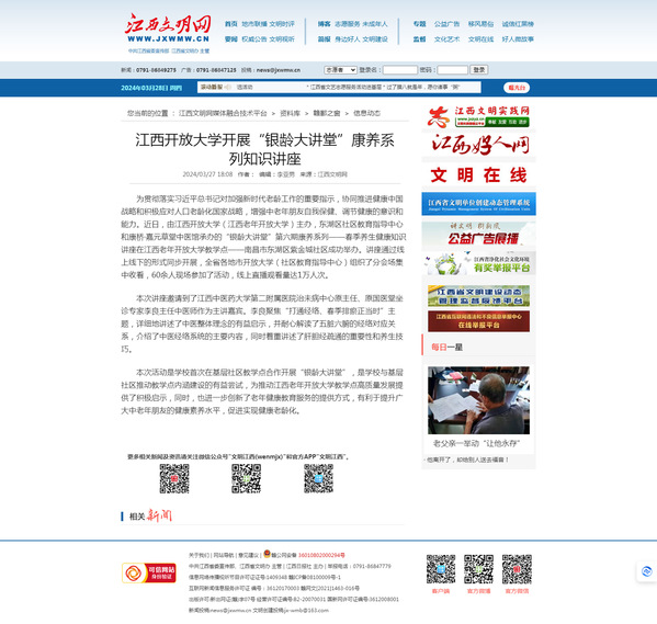 为贯彻落实习近平总书记对加强新时代老龄工作的重要指示,协同推进健康中国战略和积极应对人口老龄化国家战略,增强中老年朋友自我保健、调节健康的意识和能力。近日,由买球的app排行榜前十名推荐(江西老年开放大学)主办,东湖区社区教育指导中心和康桥·嘉元草堂中医馆承办的“银龄大讲堂”第六期康养系列——春季养生健康知识讲座在江西老年开放大学教学点——南昌市东湖区紫金城社区成功举办。讲座通过线上线下的形式同步开展,全省各地市开放大学(社区教育指导中心)组织了分会场集中收看,60余人现场参加了活动,线上直播观看量达1万人次。