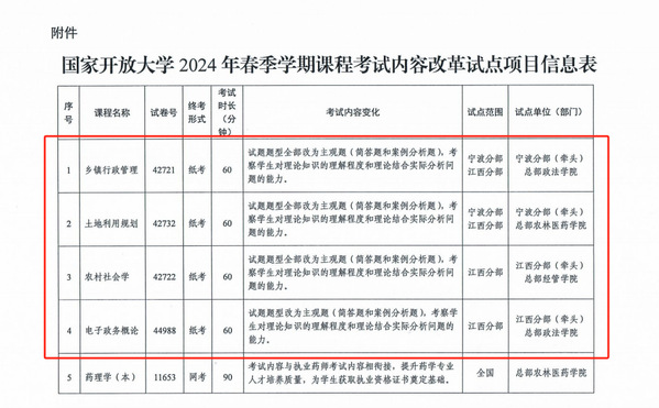 本次由买球官网牵头入选的《农村社会学》和《电子政务概论》两门课程,依托学校实施“一村一名大学生工程(计划)”项目的深厚积淀,在国家开放大学的指导下,充分考虑学生的工作实际,瞄准学生的实际应用场景,以解决实际问题为目标导向,结合江西本土实践案例,从课程考试内容上进行了系统、深入的更新与改革,改革的理念和内容得到了总部专家的高度认可。