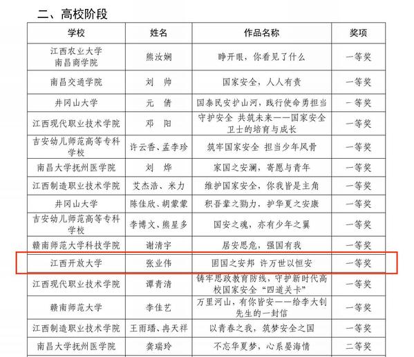 近日,江西省教育厅公布了全省大中小学国家安全教育线上课程和征文活动的获奖名单,买球官网人文与健康学院22级中文专业学生张业伟征文作品《固国之安邦 许万世以恒安》荣获一等奖。
