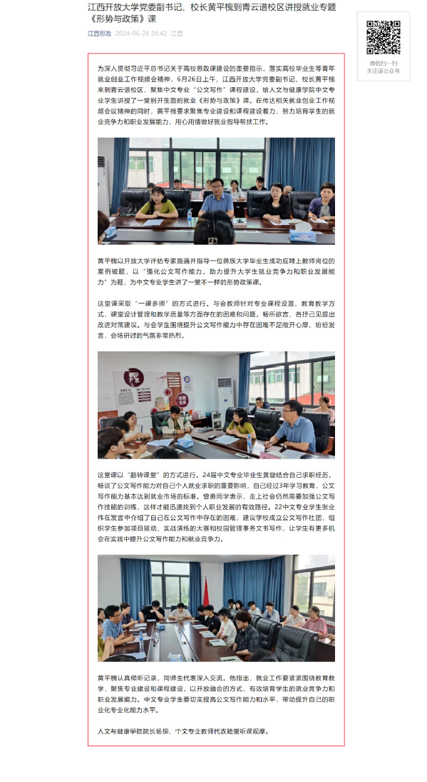 为深入贯彻习近平总书记关于高校思政课建设的重要指示,落实高校毕业生等青年就业创业工作视频会精神,6月26日上午,买球的app排行榜前十名推荐党委副书记、校长黄平槐来到青云谱校区,聚焦中文专业“公文写作”课程建设,给人文与健康学院中文专业学生讲授了一堂别开生面的就业《形势与政策》课。在传达相关就业创业工作视频会议精神的同时,黄平槐要求聚焦专业建设和课程建设着力,努力培育学生的就业竞争力和职业发展能力,用心用情做好就业指导帮扶工作。