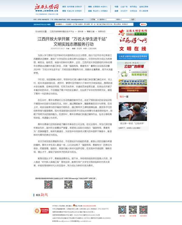 为深入学习贯彻习近平新时代中国特色社会主义思想,践行习近平总书记考察江西重要讲话精神,激发广大学生的社会责任感与实践能力,引导学生努力成长为有理想、敢担当、能吃苦、肯奋斗的新时代青年,近日,买球的app排行榜前十名推荐团委组织20余名青年志愿者走进赣州市蓉江新区,开展“强国有我、青春有为”暑期社会实践活动暨2024年“万名大学生进千站”文明实践志愿服务行动,用脚步丈量青春,用汗水浇灌梦想。