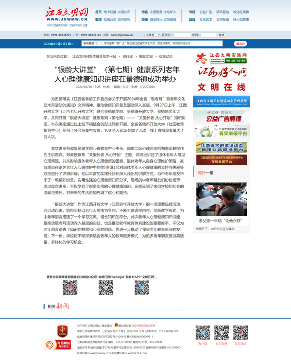 为贯彻落实《江西省老龄工作委员会关于开展2024年全省“敬老月”暨老年文化艺术月活动的通知》文件精神,推动健康知识普及活动深入基层,9月27日上午,买球的app排行榜前十名推荐(江西老年开放大学)联合景德镇学院、景德镇开放大学、景德镇老年大学,共同开展“银龄大讲堂”健康系列(第七期)——“关爱长者 从心开始”知识讲座。本次讲座通过线上线下相结合的形式同步开展,全省各地市开放大学(社区教育指导中心)组织了分会场集中收看,100 余人现场参加了活动,线上直播观看量达 1万人次。