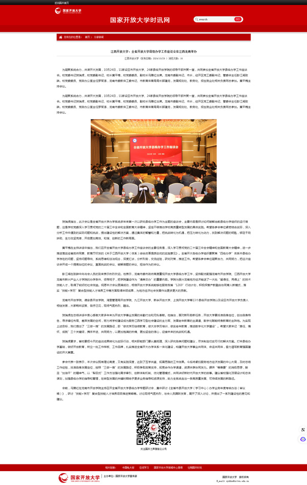 为凝聚系统合力,共谋开大发展,10月24日,11家设区市开放大学、24家县级开放学院的领导干部齐聚一堂,共同参加全省开放大学县级办学工作座谈会。校党委书记贺瑞虎,校党委副书记、校长黄平槐,校党委委员、副校长冯豫红出席。龙南市委副书记、市长,经开区党工委副书记、管委会主任彭江闽致辞。校党委委员、党政办公室主任罗军涛,龙南市委教体工委书记、市教育体育局局长郭建龙,发展规划处、教务处、招生就业处相关负责同志参加。黄平槐主持会议。