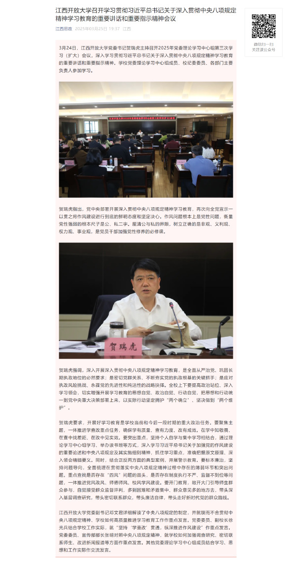 3月24日,买球的app排行榜前十名推荐党委书记贺瑞虎主持召开2025年党委理论学习中心组第三次学习(扩大)会议,深入学习贯彻习近平总书记关于深入贯彻中央八项规定精神学习教育的重要讲话和重要指示精神。学校党委理论学习中心组成员、校纪委委员、各部门主要负责人参加学习。