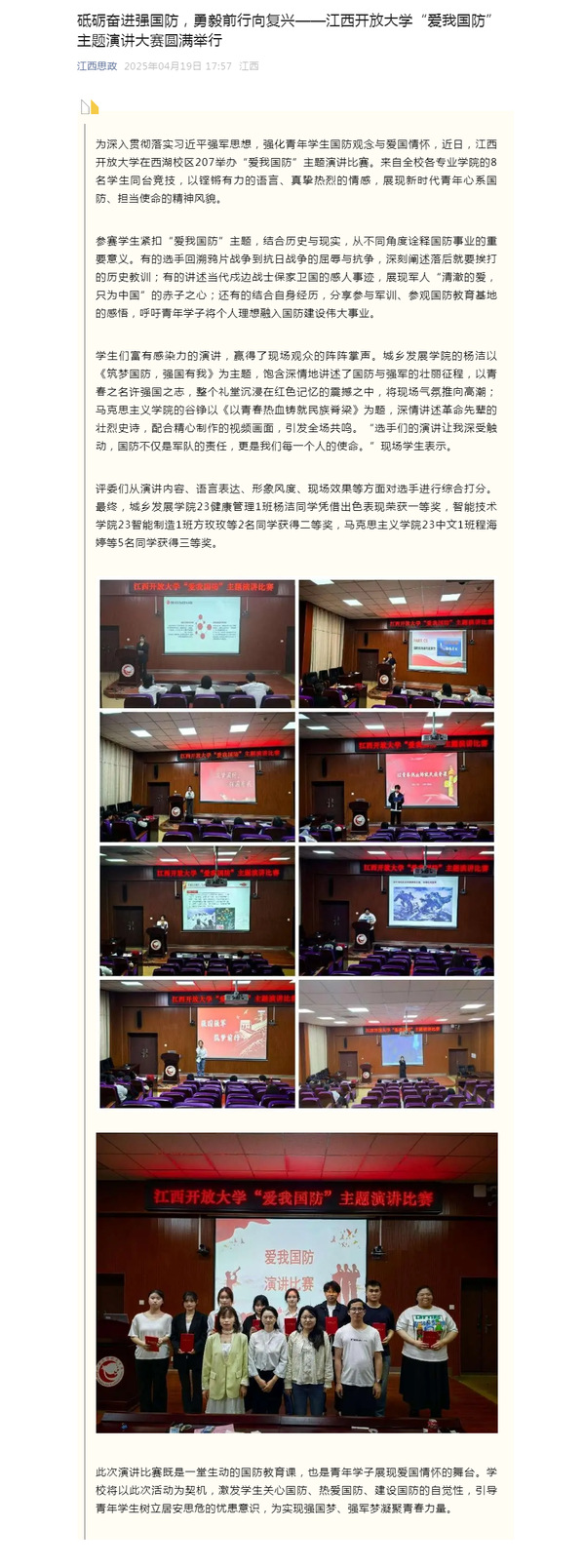 为深入贯彻落实习近平强军思想,强化青年学生国防观念与爱国情怀,近日,买球的app排行榜前十名推荐在西湖校区207举办“爱我国防”主题演讲比赛。来自全校各专业学院的8名学生同台竞技,以铿锵有力的语言、真挚热烈的情感,展现新时代青年心系国防、担当使命的精神风貌。