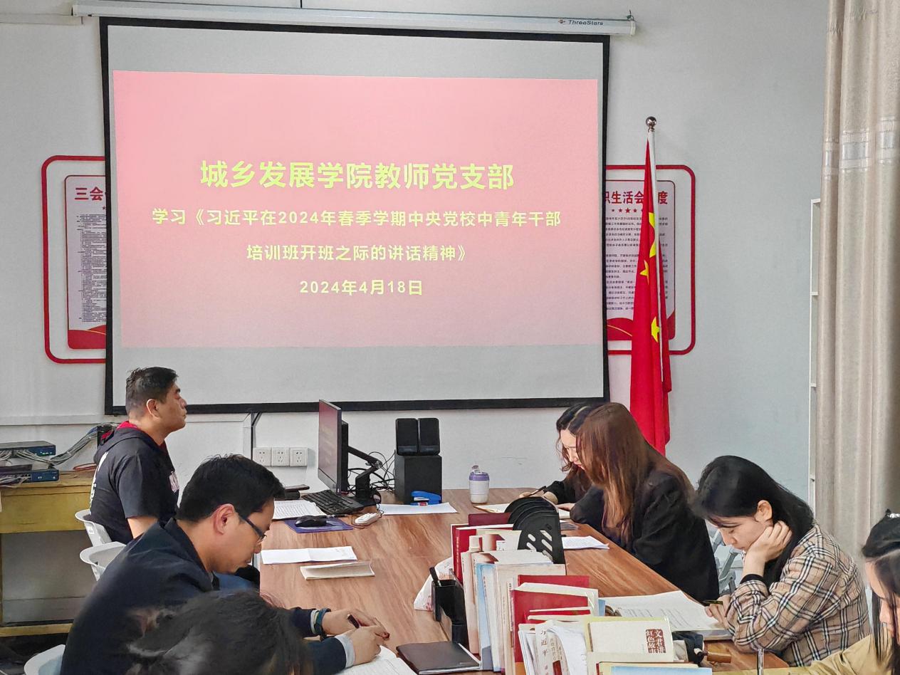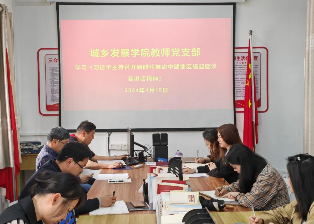 4月18日下午,城乡发展学院教师党支部组织了主题学习活动,主要围绕《习近平主持召开新时代推动中部地区崛起座谈会讲话精神》、《习近平在湖南考察时强调坚持改革创新求真务实奋力谱写中国式现代化湖南篇章》、《习近平在2024年春季学期中央党校中青年干部培训班开班之际的讲话精神》和《中国共产党党员网络行为规定》等文件精神展开学习。