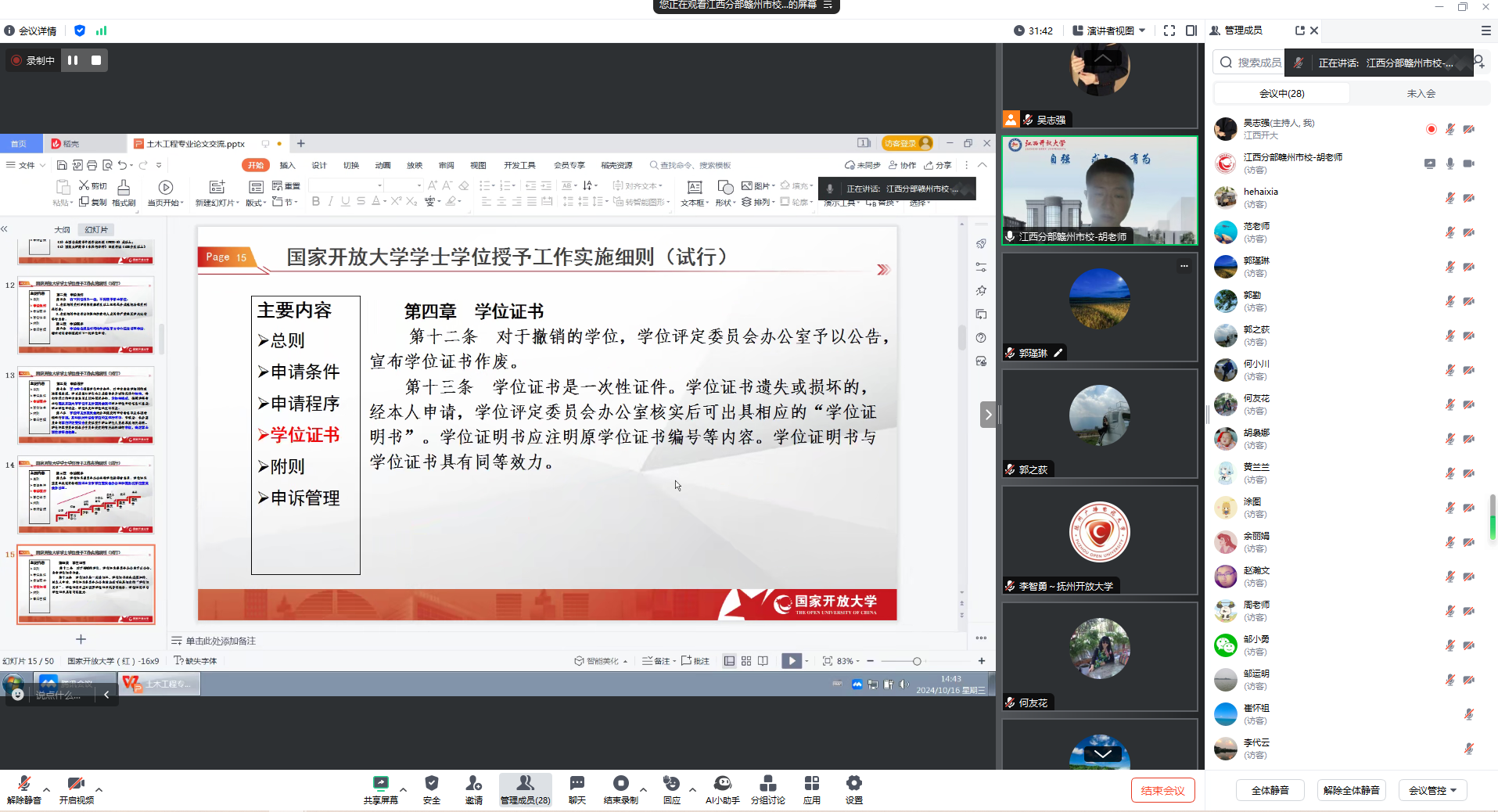 会议邀请赣州开放大学土木工程专业负责人胡过昱老师做关于“土木工程专业毕业设计指导及学位论文要求”专题讲座,从毕业设计的目的、选题与资料收集、设计要求与应提交的成果、应注意的问题及生产实习的组织方式与要求等五个方面进行了讲授,并就学位论文写作要求做了详细说明,为土木工程专业毕业设计工作提供了指导。农村区域发展专业责任教师邹运明介绍农村区域发展专业综合实践环节的相关要求及学位论文写作;护理专业责任教师胡袅娜做关于介绍护理本、专科毕业论文(设计)指导;分别介绍了专业实习要求与组织实施、毕业论文指导老师选聘、选题、撰写、答辩和学位论文申请等内容,为农村区域发展、护理专业毕业实践工作提供了指导。