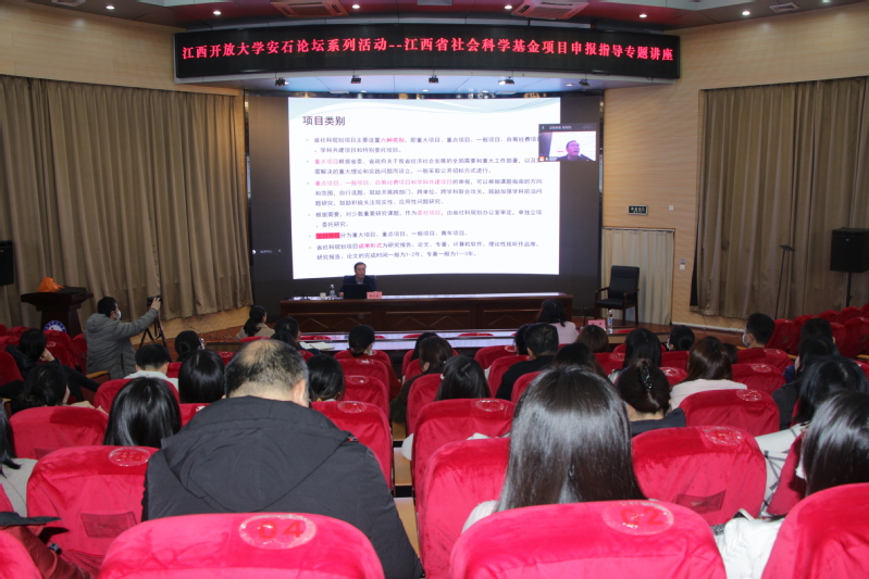 为进一步提升学校科研水平,增强教职工的科研素养,3月29日下午,学校特邀江西师范大学学报杂志社总编戴利朝教授为买球官网专业技术人员做“江西省社会科学基金项目申报指导”专题讲座。全校各学院、各部门100余人现场参与,其余教师通过线上方式收看。科研管理处处长张睿教授主持讲座。