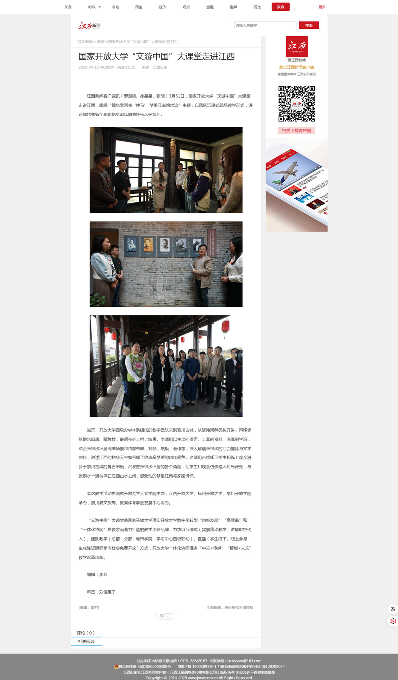 3月31日,国家开放大学“文游中国”大课堂走进江西,围绕“赣水黎河生‘仲马’ 梦里江南恨水流”主题,以团队沉浸式现场教学形式,讲述现代著名作家张恨水的江西情怀与文学创作。