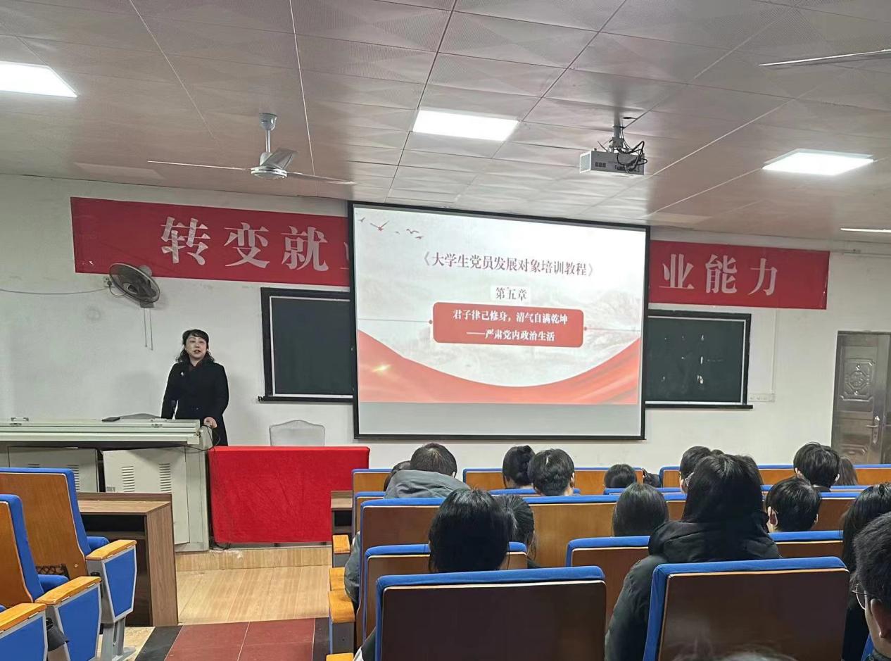 11月4日下午16:30,杨柳院长在1101教室为学院2023年第二批党员发展对象作《君子律己修身,清气自满乾坤——严肃党内政治生活》和《治国必先治党,治党务必从严——坚持全面从严治党》专题党课培训,全体发展对象参与学习。