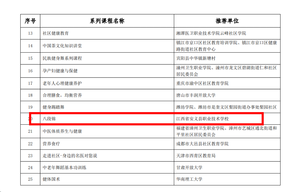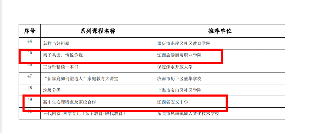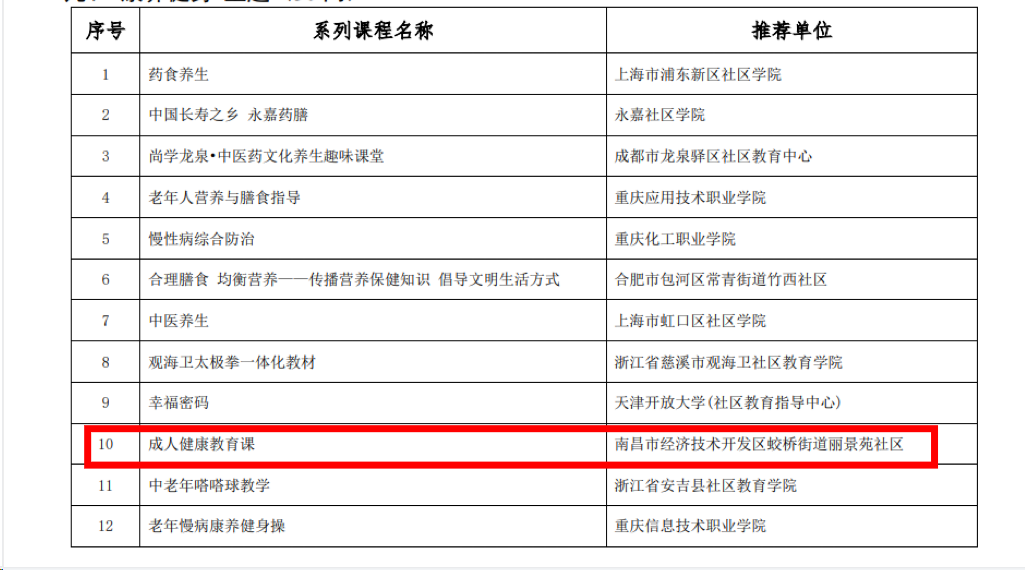 近日,从《教育部办公厅关于推介2023年县域社区学习中心典型案例和社区教育品牌课程的通知》(教职成函〔2024〕8号)获悉:2023年县域品牌社区学习中心典型案例和品牌课程已完成了评审和公示,我省组织申报的东湖区社区教育指导中心典型案例(南昌市东湖区社区教育指导中心)入选县(市、区)社区教育学院样板案例;《银龄智慧学堂》(九江职业技术学院)、《亲子共读,情悦你我》(江西旅游商贸职业学院)、《高中生心理特点及家校合作》(江西省安义中学)、《成人健康教育课》(南昌市经济技术开发区蛟桥街道丽景苑社区)、《八段锦》(江西省安义县职业技术学校)5门课程入选县域社区教育品牌课程。