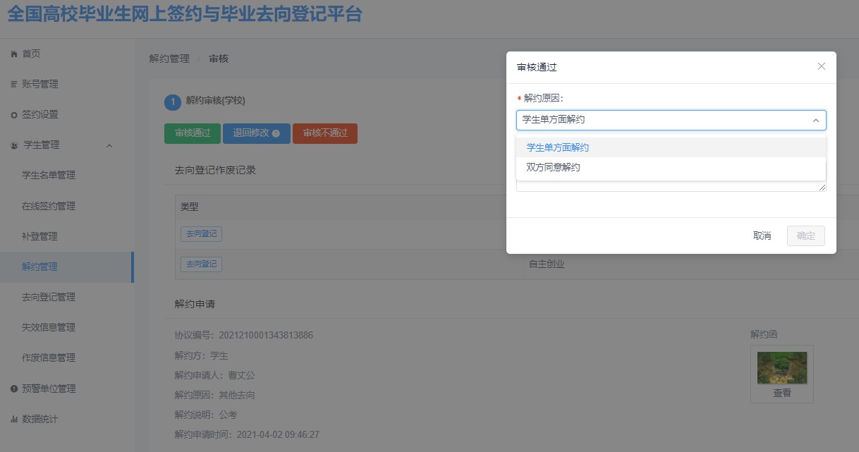 注意:当用人单位不能提供解约材料,导致毕业生无法正常解约,影响其继续签约或登记去向信息时,学校用户在核实情况后可让毕业生上传情况说明材料。点击“审核通过”后解约原因选择“学生单方面解约”,填写具体情况说明,提交后毕业生即完成解约。特别提醒该功能仅对学校用户开放,院系用户无此功能,请谨慎使用,使用前应与用人单位协商一致以防出现纠纷。