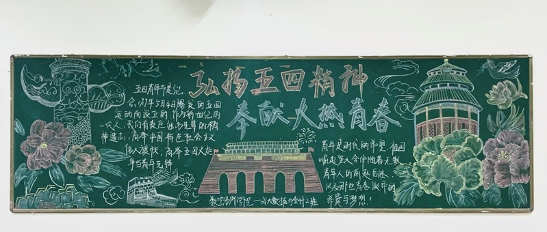 活动得到了各班级的积极响应,同学们充分利用课余时间,围绕主题精心设计板报。板报内容主要解读五四精神、阐释五四青年节的来历、名人名言等,同学们利用黑板报这一宣传阵地,用生动的文字、优美的图画、充满创意的色彩搭配,呈现出新时代大学生对五四精神的理解与感悟,充分展现了同学们积极向上的精神风貌,营造了浓郁的校园文化氛围。