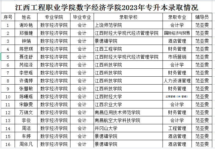 百舸争流千帆竞,借海扬帆奋者先。江西工程职业学院数字经济学院2020级毕业生在江西省普通专升本考试中喜获佳绩。截至6月7日,有95名同学分别被江西财经大学、井冈山大学、南昌理工学院、景德镇陶瓷大学、东华理工大学等10余所本科院校录取,录取比例创历史新高。