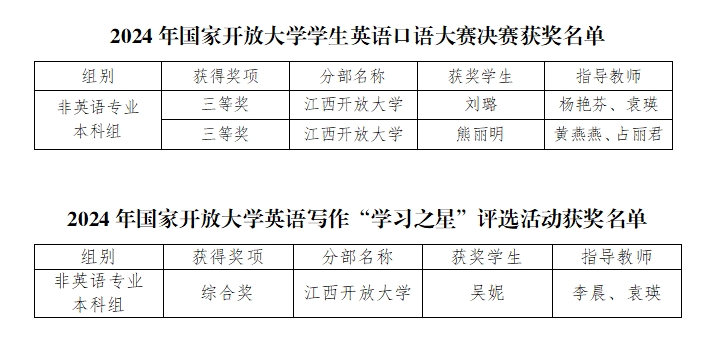 近日,国家开放大学揭晓两项活动评选结果,买球官网共斩获三个奖项,充分展现了开放教育学生扎实的知识储备和良好的精神风貌。在英语口语大赛决赛中,新余开放大学刘璐、抚州开放大学熊丽明获非英语专业本科组三等奖,新余开放大学教师杨艳芬、袁瑛、抚州开放大学教师黄燕燕、占丽君获优秀指导教师奖;在英语写作“学习之星”评选活动中,新余开放大学吴妮获得非英语专业本科组综合奖,新余开放大学教师李晨、袁瑛获优秀指导教师奖。